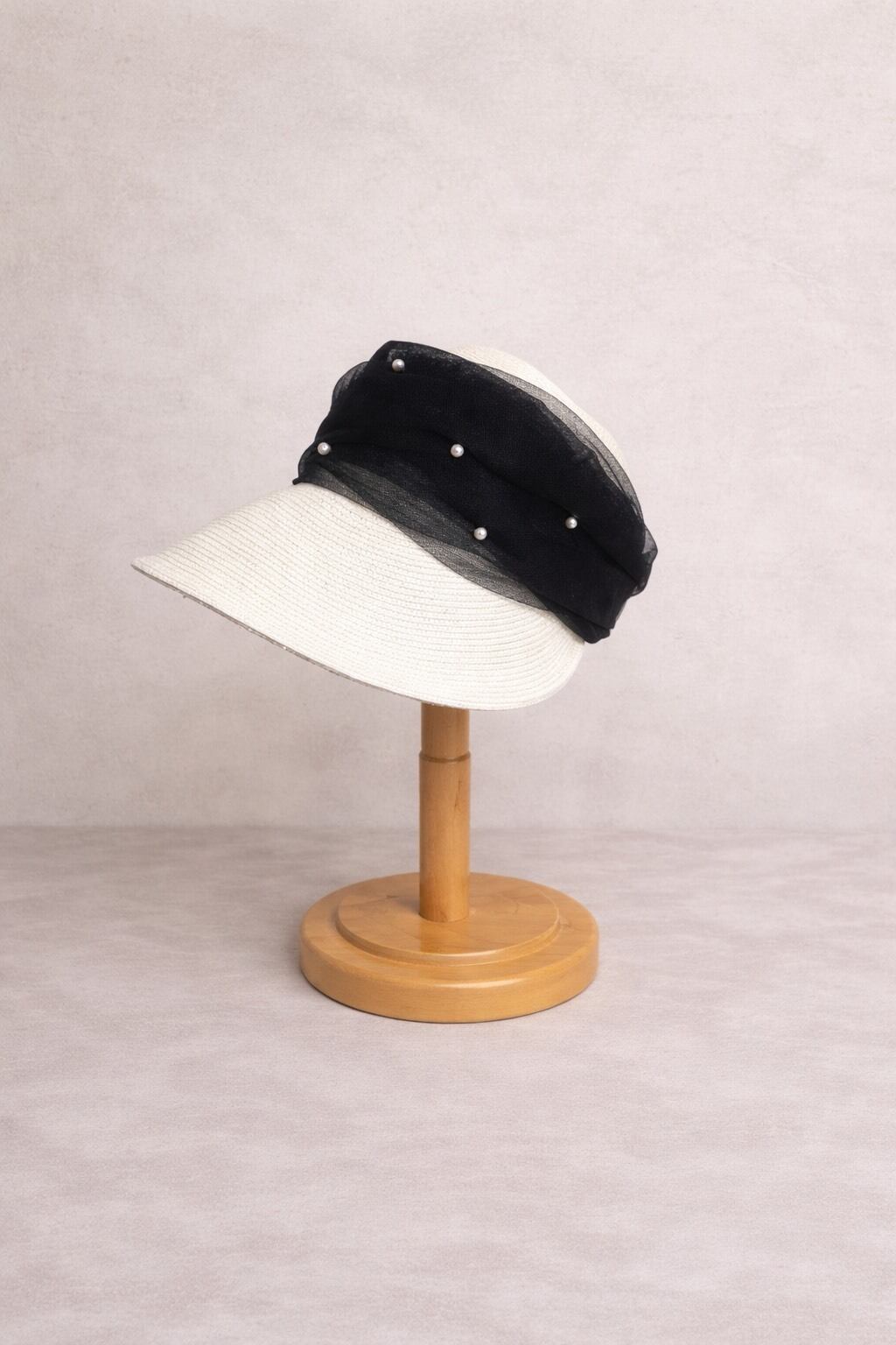 パールとチュールの装飾が特徴で、エレガントな雰囲気を演出。シンプルながらも洗練されたデザインで、どんなスタイルにも合わせやすい。